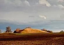 Till plains are regions of flat to gently sloping topography, composed of till deposited by a melting glacier. Till plains may also be referred to as a region of ground moraines.[10] Different from outwash plains, till plains form when a section of ice breaks off from the main glacier. The sediment contained in this ice is deposited as a till plain when the ice melts.[4] The till is further dispersed and molded by the resulting meltwater. The composition of a till plain varies greatly and is dependent upon the path the glacier took and the bedrock underlying the glaciated region.[10] Till plains are composed of poorly sorted sediment ranging in size from sand to large boulders. Landforms contained in a till plain include drumlins and moraines which are composed of glacial till.[24]
