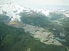 An outwash plain is a relatively flat region at the terminus of a glacier where glacial sediments are deposited by meltwater outwash. The sediment is distally sorted, the larger sediment being deposited closer to the margin of the glacier and finer-grained sediment carried further along by the meltwater streams.[22] Outwash plains may contain other glaciofluvial landforms including meltwater streams, kames, and kettle lakes. River systems in outwash plains typically form braided rivers due to the high sediment content in the water. [23]