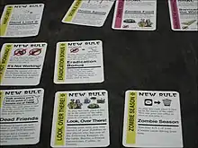 Later sets sometimes included new card subtypes, depending on the theme of the set. These include included Creeper cards that block or make goals more difficult to obtain;[10] Ungoal cards, which have conditions where the game ends with no winner;[12] and Surprise cards, a 2011 addition, which allow players to negate other types of cards which could prevent a victory and can be played at any time, though they have other effects when played on one's own turn.[17]