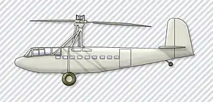 In the first half of the Second World War, the DFS 230B assault glider was used primarily to land troops and supplies, but was found of limited capability as it needed a relatively large landing area. The Fa 225 was conceived to marry the rotor of the Focke-Achgelis Fa 223 with the fuselage of the DFS 230B, allowing the glider to land in 18m or less.[1] The rotor was mounted on a framework of struts above the centre of gravity and strengthened long stroke undercarriage units were fitted either side and at the tail.[2]