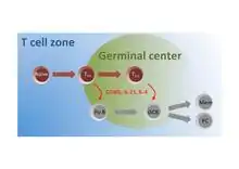 Follicular helper T cells (also known as follicular B helper T cells and abbreviated as TFH), are antigen-experienced CD4+ T cells found in the periphery within B cell follicles of secondary lymphoid organs such as lymph nodes, spleen and Peyer's patches, and are identified by their constitutive expression of the B cell follicle homing receptor CXCR5.[1] Upon cellular interaction and cross-signaling with their cognate follicular (Fo B) B cells, TFH cells trigger the formation and maintenance of germinal centers through the expression of CD40 ligand (CD40L) and the secretion of IL-21[2] and IL-4.[3] TFH cells also migrate from T cell zones into these seeded germinal centers, predominantly composed of rapidly dividing B cells mutating their Ig genes. Within germinal centers, TFH cells play a critical role in mediating the selection and survival of B cells that go on to differentiate either into long-lived plasma cells capable of producing high affinity antibodies against foreign antigen, or germinal center-dependent memory B cells capable of quick immune re-activation in the future if ever the same antigen is re-encountered.[4] TFH cells are also thought to facilitate negative selection of potentially autoimmune-causing mutated B cells in the germinal center. However, the biomechanisms by which TFH cells mediate germinal center tolerance are yet to be fully understood.
