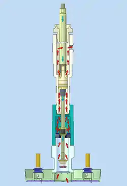 If an ordinary intake socket is lowered into highly viscous material, the material will flow so slowly, that after short time, the pump will soak up air, because the socket is not fully covered by the material anymore. To avoid that, a plate, closing tight to the wall of the barrel by a soft sealing lip, is put on top of the material in the barrel. This plate is lowered slowly so that the material rises through a hole in the center of the plate into the intake socket. The pumped amount and the amount lifted through the plate have to be precisely the same. This must be ensured by appropriate control of the follower plate.