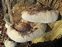 Fomitopsis ochracea is a fungus that may be shaped like a hoof or flattened in a fan-like manner.[1] It can grow quite large, up to 20 cm in width and 7 cm thick.[1] The top surface of the fungus is smooth and may be coloured white, grey, brown, or black, with parallel lines.[1] It can have black or brown spotting on the surface.[2] The underside is a creamy-white, with even, round pores.[1] It can also become orange with age.[2] If broken open, the context will be woody with a creamy-white colour and no bands.[1] There is no visible bruising upon breaking open the body.[1] There are about 5-6 pores present per millimetre.[1] It can have a faint sweet odour.[2]