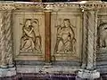 The lower basin is made up of 25 mirrors, each divided into 2 tiles that describe the 12 months of the year, each of which is related to a zodiac symbol. Each month is connected to scenes of daily life and the farming work that characterize it. As in other contemporary sculptures from Europe, in which the months are represented, here the manual work obtains dignity.[5] In this basin manual labour is in fact represented together with the arti liberali (liberal arts), with philosophy, with characters from the Bible and the history of Rome; in this specific order:[6]