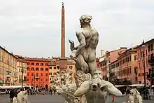 Fontana del Moro (Moor Fountain) is a fountain located at the southern end of the Piazza Navona in Rome, Italy. It represents a Moor, or African (perhaps originally meant to be Neptune), standing in a conch shell, wrestling with a dolphin, surrounded by four Tritons. It is placed in a basin of rose-colored marble.