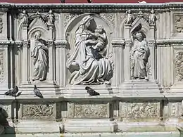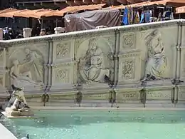 The first fountain in the Piazza del Campo was completed in 1342, after hydraulic construction had led water to the site. Underground pipes brought water to the site from 25 kilometers away.[1] Legend holds that the fountain was met with much joy, thus it was given the name Gaia or joyous. Others suggest the term Gaia refers to the Latin term for "bride", and that the fountain was dedicated to the bride of God and patron of Siena, the Virgin Mary.[2] The fountains, plates, and statues conflate Roman matrons' cardinal virtues, with a central relief of the Madonna and Child, curiously framed by stories of Genesis.