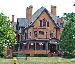 The Ford–Bacon House is a four-story Queen Anne house built from buff-colored brick with red sandstone trim.[2][7] The house measures 62 feet by 95 feet, sits on four city lots, and contains 27 rooms and 11 fireplaces.[3][7] A wide porch extends along the front and side of the house, and the hipped roof was originally covered with black slate.[7] A four-story bell tower is located in the rear, and the house features gabled dormers, a two-story side bay, and square brick chimneys.[2]