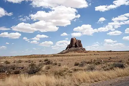 Ford Butte is a 6,156-foot (1,876 meter) elevation summit located on Navajo Nation land in San Juan County of northwest New Mexico, United States.[4] It is a landmark set one mile east of U.S. Route 491, along with its nearest higher neighbor, Bennett Peak, on the opposite side of the highway. Ford Butte is one of the major diatremes of the Four Corners area, and with significant relief as it rises 450 feet (137 meters) above the high-desert plain.[1] It is situated about 22 miles (35 km) south-southeast of Shiprock, the most famous of these diatremes. Ford Butte is set in the northeastern part of the Navajo Volcanic Field, a volcanic field that includes intrusions and flows of minette and other unusual igneous rocks which formed around 30 million years ago during the Oligocene.[5] This geographical feature's name was officially adopted in 1915 by the U.S. Board on Geographic Names.[4]