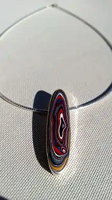 Fordite, also known as Detroit agate or Motor City agate,[1] is old automotive paint which has hardened sufficiently to be cut and polished.[2] It was formed from the buildup of layers of enamel paint slag on tracks and skids on which cars were hand spray-painted (a now automated process), which have been baked numerous times.[3] In recent times the material has been recycled into jewelry.[4]