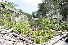 The second floor of the warehouse was allowed to be used for the processing of seeds for a community project. The oil extracted from those seeds greatly accelerated the rotting of the wooden floor which has collapsed in some areas.