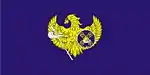 The flag is a blue flat fabric. The ratio of the width and length of the flag is 1:2. In the center of the flag is a yellow expressive eagle with outstretched wings, while on the right forearm of the eagle is an amulet spear made of white flame of a horse. On the left side of the eagle is a national silver shield with a round blue border, the middle part of which is diagonally combined with two ribbons made of gold national ornaments. In the center of the shield is an amulet made of white horse flame.[5]