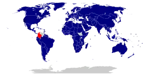The major organizations in which Colombia is a member include: the Agency for the Prohibition of Nuclear Weapons in Latin America and the Caribbean, Andean Pact, Caribbean Development Bank, Economic Commission for Latin America and the Caribbean, Food and Agriculture Organization of the United Nations, Group of 3, Group of 11, Group of 24, Group of 77, Inter-American Development Bank, International Atomic Energy Agency, International Bank for Reconstruction and Development, International Chamber of Commerce, International Civil Aviation Organization, International Criminal Police Organization (Interpol), International Development Association, International Finance Corporation, International Fund for Agricultural Development, International Labour Organization, International Maritime Organization, International Maritime Satellite Organization, International Monetary Fund (IMF), International Olympic Committee, International Organization for Migration, International Organization for Standardization, International Telecommunication Union, International Telecommunications Satellite Organization, International Trade Union Confederation, Latin American Economic System, Latin American Integration Association, Non-Aligned Movement, Organization of American States (OAS), Permanent Court of Arbitration, Rio Group, United Nations (UN), UN Conference on Trade and Development, UNESCO, UN Industrial Development Organization, UN Office of the High Commissioner for Refugees, Universal Postal Union, World Confederation of Labour, World Federation of Trade Unions, World Health Organization, World Intellectual Property Organization, World Meteorological Organization, World Tourism Organization, and World Trade Organization.[4] An OAS observer has monitored the government's peace process with the paramilitaries, lending the negotiations much-needed international credibility.[4] The United States helps Colombia secure favorable treatment from the IMF.