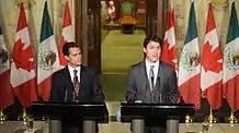 Since the North American Free Trade Agreement (NAFTA) went into effect on January 1, 1994, relations between Canada, Mexico and the United States have significantly strengthened politically, economically, socially and culturally.[103] During the Fox administration, a further integration towards Mexico's northern neighbors was a top priority.[9] The September 11 attacks changed the priorities of U.S. foreign policy toward the strengthening of regional security.[104] As a result, several trilateral summit meetings regarding this issue have occurred within the framework of the Security and Prosperity Partnership of North America (SPP), a region-level dialogue with the stated purpose of providing greater cooperation on security and economic issues,[105] founded in Waco, Texas on March 23, 2005 by Paul Martin, former Prime Minister of Canada, Vicente Fox, then-President of Mexico, and George W. Bush, former President of the United States.[105]
