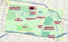 Forest Park is home to five of the region's major institutions: the St. Louis Art Museum, the St. Louis Zoo, the St. Louis Science Center, the Missouri History Museum, and the Muny amphitheater.[33] It has several recreational facilities, including the Dwight Davis Tennis Center, the Steinberg Skating Rink, the Boathouse Restaurant (with boat rentals), the Forest Park Golf Course, the Highlands Golf and Tennis Center, handball courts, and fields for softball, baseball, soccer, cricket, rugby, and archery. The park also features over 30 miles of walking and bicycling paths.[2]