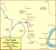The first railways—in fact plateways—in the Forest of Dean were designed to connect the rivers Severn and Wye, and it was not until 1806 that a serious proposal came forward to take minerals down the eastern area, southward along the Cinderford valley. That idea failed to progress, but the promoters together took land leases and announced that they would build a railway despite the setback. Work began on the line northward from Bullo Pill; no Parliamentary authority was needed as the land had been acquired.[1][2]