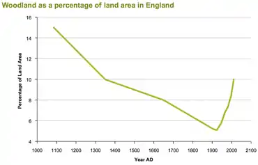The Forestry Commission was established in 1919, in order to address a lack of timber following the First World War: at this point Britain had only 5% of its original forest cover left and the government at that time wanted to create a strategic resource of timber.[45] Since then forest coverage has doubled and the commission's remit expanded to include greater focus on sustainable forest management and maximising public benefits. Woodland creation continues to be an important role of the commission, however, and works closely with government to achieve its goal of 12% forest coverage by 2060,[46] championing initiatives such as The Big Tree Plant and Woodland Carbon Code. Originally, the commission operated across Great Britain, however in 2013 Natural Resources Wales took over responsibility for Forestry in Wales,[47] whilst two new bodies (Forestry and Land Scotland and Scottish Forestry) were established in Scotland on 1 April 2019.[48] The Commission retains responsibility for forestry in England, as well as co-coordinating international forestry policy support and certain plant health functions in respect of trees and forestry across the UK.[49] The Forestry Commission is also the government body responsible for the regulation of private forestry in England; felling is generally illegal without first obtaining a licence from the commission.[50] The commission is also responsible for encouraging new private forest growth and development. Part of this role is carried out by providing grants in support of private forests and woodlands.