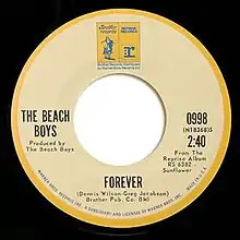 "Forever" is a song by American rock band the Beach Boys from their 1970 album Sunflower. It was written by Dennis Wilson and Gregg Jakobson. Dennis sang lead vocal. His brother Brian assisted with the arrangement.[1]