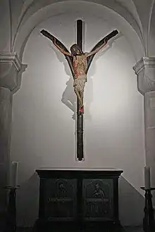 The cross at St. Mary's in the Capitol was carved in the 14th century (before 1312). Restoration work in recent years revealed much of the late medieval, second painting (Zweitfassung). Small sections of the exposed, first painting revealed astonishing similarities with the original coat of paint of the Bocholt Cross, once again visible since 1967, which used the Cologne Cross as a prototype, even though different sculptors were employed.