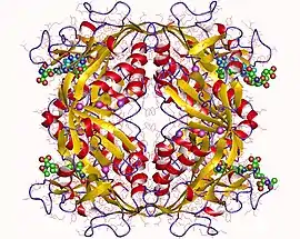 Ftr from the thermophilic methanogen Methanopyrus kandleri (which has an optimum growth temperature 98 degrees C) is a hyperthermophilic enzyme that is absolutely dependent on the presence of lyotropic salts for activity and thermostability. The crystal structure of Ftr, determined to a reveals a homotetramer composed essentially of two dimers. Each subunit is subdivided into two tightly associated lobes both consisting of a predominantly antiparallel beta sheet flanked by alpha helices forming an alpha/beta sandwich structure. The approximate location of the active site was detected in a region close to the dimer interface.[1] Ftr from the mesophilic methanogen Methanosarcina barkeri and the sulphate-reducing archaeon Archaeoglobus fulgidus have a similar structure.[2]