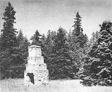 As of 2012, the Fort Drummond site is private property, and the site is only viewable from the water.[17] At least one of the remaining chimneys has been incorporated into a cabin.[18] The Fort Drummond site contains 74 features, most of which are the remains of chimneys and structural platforms. There are also two wells, two wharves, and a cemetery.[2] Faint traces of foundations can still be seen.[18]