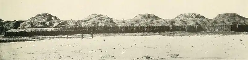The land defense extended 1,800 feet (550 m), over fifteen mounds. It held twenty-five guns which were 32 feet (10 m) above sea level. The mounds were connected by an underground network which could not be penetrated by artillery. Below, the refuge was also used as an arsenal. In front of the walls, a 9-foot (2.7 m) tall stake fence was used.