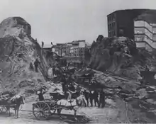 Fort Hill was located near what is today the intersection of Oliver and High Streets. At least until 1675, (see map) the hill jutted out into the Atlantic Ocean, hence the designation of being a "point". Its height and proximity to the sea made the hill an advantageous point to put defensive cannons. Between 1866 and 1872, the City of Boston undertook a redevelopment project on Fort Hill in attempt to add more land for business facilities. The project called for the Hill to be leveled, for the streets to be widened, and for all buildings to be razed.[1][2] Today the land is flat and largely occupied by the towers of International Place. Landfill has also extended the shoreline outward, so the location of the old fort is no longer directly on the waterfront.