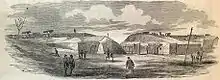 ![]() An interior sketch of Fort Runyon, showing activity at the fort during August 1861. The Capitol building is faintly visible in the background, across the Potomac River. | |