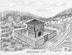 In 1755, during the French and Indian War, marauding Indians allied with the French attacked European settlers along the Blue Mountains of Pennsylvania. Several of these attacks occurred near the Swatara Gap area. Peter Hedrick and other Swatara Gap area settlers fortified Hedrick's farmstead by building a log-walled stockade around the structure. This was the beginning of Fort Swatara.[1][2] On January 25, 1756, Captain Frederick Smith and a company of 50 militiamen received orders from Robert Hunter Morris, deputy governor of Colonial Pennsylvania, to take posts at Swatara Gap. Capt. Smith's orders were to occupy the existing fortification at Hedrick's farmstead and reinforce it if necessary. Smith's troops erected a military-style log blockhouse and magazine shed for ammunition storage and surrounded the structures with a sturdy log stockade.[3][4]