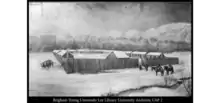 In late 1849, tensions between Ute Indians and members of the Church of Jesus Christ of Latter-day Saints in Utah Valley escalated after a Church member killed a Ute known as Old Bishop, whom he accused of stealing his shirt.[4] The Mormon and two associates then hid the victim's body in the Provo River. Details of the murder were likely withheld, at least initially, from Brigham Young and other Church leaders. Settlers at Fort Utah did, however, report other difficulties with the Indians, including the firing of weapons at settlers and the theft of livestock and crops. Brigham Young counseled patience, telling them to "stockade your fort, to attend to your own affairs and let the Indians take care of theirs."[5] Tensions mounted at Fort Utah after the Utes demanded that the settlers turn over the murderers[6] because the settlers refused to turn over those involved in the murder of Old Bishop to the Utes or to pay reparations for his death. In the winter of 1849–1850, a measles epidemic spread from the Mormon settlers to the Ute camps, killing many Indians and heightening tensions. At a council of ecclesiastical leaders in Salt Lake City on January 31, 1850, the leader of Fort Utah reported that the Utes’ actions and intentions were growing increasingly aggressive: "they say they mean to hunt our Cattle. & go & get the other Indians to kill us."[7] In response, Brigham Young authorized a campaign against the Utes [8] telling them to kill all the men and take the women and children captive. On February 8, 1850, a militia from Salt Lake surrounded a group of around seventy people at Big Elk. After two days of fighting, the Utes surrendered. The army killed the men and sent the women and children up to Salt Lake as prisoners. A series of battles in February 1850 resulted in the deaths of dozens of Utes and one Mormon.[9] These events contributed to the Walker War.[10]