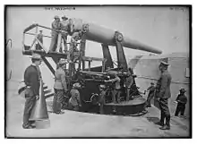 Following the American entry into World War I, Fort Wadsworth's role as the largest fort guarding New York City was an important one. Some batteries were directed to be ready to fire 24/7.[3] Most coastal forts in CONUS had their garrison reduced to provide crews for heavy and railway artillery units destined for the Western Front. This did not seem to occur at Fort Wadsworth. Also, a number of 10-inch and 12-inch guns were withdrawn from forts in 1917-1918 for potential use as railway artillery;[13] at Fort Wadsworth most of these weapons were relatively promptly replaced by guns from less-threatened forts. Both guns of Battery Ayres, one gun of Battery Hudson, and one gun of Battery Upton were replaced in 1918 due to this program. However, Battery Barry's pair of 10-inch guns was removed and not replaced.[3]
