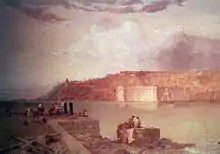 The first use of the land for military purposes was as the site of a blockhouse built by Dutch settler David Pieterszen de Vries in 1663 on Signal Hill (now the site of Fort Tompkins),in 1655.[1][2] The site is said to have been continuously garrisoned since another blockhouse was built in 1663, which survived at least through 1808.[1] During the American Revolution the area became known as Flagstaff Fort; captured by the British in 1776, it remained in British hands and was expanded until the war's end in 1783. It became the responsibility of New York State in 1806, at which time four forts were built on the site with state resources, being ready for service in 1808 though incomplete. These included the red sandstone Forts Richmond (on the site now called Battery Weed) and Tompkins, on the sites of the current forts but of different design, and Forts Morton and Hudson, with positions for a total of 164 guns in the four forts.[1][3] Fort Tompkins at that time included a red sandstone enclosure containing the 1663 blockhouse.[1] Fort Richmond was initially semicircular while Fort Tompkins was a regular pentagon with circular bastions, both very different from their Third System replacements.[4] Although these forts were contemporary with the federal government's second system of seacoast fortifications, they were not part of the federal program. Federal rebuilding of Forts Richmond and Tompkins did not begin until 1847.[1]