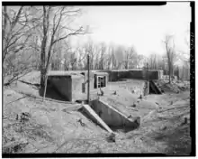 Although Fort Wadsworth was an important mobilization center, it received little new armament in World War II. New defenses for Greater New York in that war centered on Fort Tilden, the long-range 12-inch batteries at Fort Hancock, and a new 16-inch gun battery at the Highlands Military Reservation in Navesink, New Jersey.[9] Fort Wadsworth's heavy guns were gradually scrapped during the war. Battery 218, a magazine bunker for a pair of 6-inch guns, was built but not armed.[3] A 16-inch gun battery (Battery 115) was proposed for Fort Wadsworth but not built.[3] Four 3-inch guns of Battery Turnbull were relocated to Battery New Turnbull, still at Fort Wadsworth.[9] Battery Catlin's six 3-inch guns were sent to new batteries on the other side of the Narrows, four to Anti-Motor Torpedo Boat Battery (AMTB) 18 (also called Battery New Catlin) at Norton Point and two to AMTB 20 at Rockaway Point.[9]