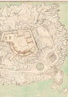 Construction of a more elaborate fort began in 1700 under Benoît de Musinot, an artillery officer with the Navy at Brest, and inventor of a swiveling mortar. His plan called for the construction of a bastion and a semi-circular battery, together with a magazine, a barracks, and a powder store.