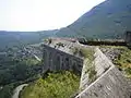 The upper fort (fort supérieure) is 200 metres (660 ft) above the lower fort. Its location allows the upper fort to control the valley, including the railroad viaduct, and to protect the lower fort. It was built between 1834 and 1848. Today, the lower fort and the subterranean steps and casemates cut into the rock above it, up to and including terraces just below the upper fort, are open during the summer months for visiting, however the upper fort is not currently safe for visitors.[5] Furthermore, a moderately difficult (AD)[6] via ferrata exists which takes climbers from the lower fort to the upper fort by traversing the rocky hillside. In addition, there are many hiking trails in the area which allow hikers access to the upper fort.