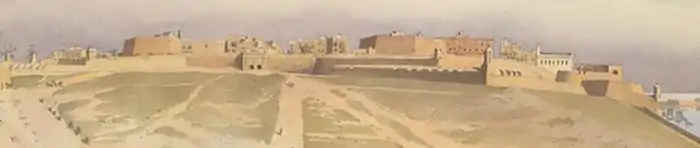 The construction of a fortified city on the Sciberras Peninsula was first proposed in 1524, when the Order of St. John sent a commission to inspect the Maltese Islands.[6] Back then, the only fortification on the peninsula was a militia watchtower built by the Aragonese in 1488.[7] The tower was strengthened in 1533, but the proposed city was not built since the Order focused on building the fortifications of Birgu, which had become their base.[8]
