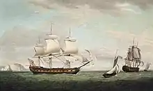 On 16 April the French attacked the British squadron and convoy at the battle of Porto Praya, off São Tiago. The French captured Fortitude, but as her captors towed her out to sea, her crew and the troops of the 92nd Regiment of Foot she was transporting,[6] re-captured her; she rejoined the British convoy a few days later.[7][lower-alpha 1]