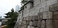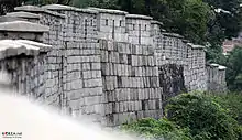 The original walls, built in the late-14th century were constructed of medium-sized round stones held together by mud. During King Sejong the Great's reign in the mid-15th century, a large-scale refurbishment work was carried out on the wall, including the replacement of earthen wall sections with rectangular stone sections.[1] A major restoration in 1704 by King Sukjong rebuilt sections of the wall using large, uniform stone slabs which mark the final and last unique characteristic of Hanyangdoseong.[2]