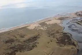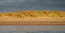 The sand dunes at Forvie can be divided into three distinct parts. The southernmost point of the reserve consists of a sand spit at the point where the River Ythan enters the sea. To the north the sand rests on raised beaches terraces and glaciated rocks. North of this region is an area where the sand lies on top of a rock plateau, with glacial deposits of varying depths sandwiched between the rock and the sand.[10] The dunes are highly mobile, and can reach up to 20 metres (66 ft) in height. As there is relatively little plant life on these mobile dunes, they have been likened to the Sahara Desert.[11]
