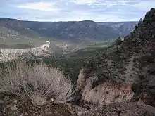 Fossil Springs, the source of about 80 percent of the water in Fossil Creek, issues from several vents in close proximity to one another at the base of the Mogollon Rim.[10] The rim is the southern edge of the Colorado Plateau. Water percolating through limestone layers in the rim becomes laden with dissolved carbon dioxide and calcium carbonate.[10] When the water emerges at the springs, it begins to release carbon dioxide as a gas and calcium carbonate as travertine, a porous form of calcite often found around hot springs such as Mammoth Hot Springs in Yellowstone National Park.[11] The release, affected by stream turbulence and other factors, does not occur all at once but continues downstream.[10]