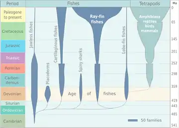 The bony (and cartilaginous) fish groups that emerged after the Devonian, were characterised by steady improvements in foraging and locomotion.[37]