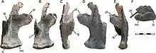 However, a recent study covering the phylogeny of Cerapoda using the same matrix as Bell et al. (2019) found Fostoria to be within the Rhabdodontomorpha, sharing the following features with the derived rhabdodontids: (1) A nearly vertical suture between its supraoccipital and opisthotics and (2) the length of the distolateral condyle on the distal extremity of femur (not accounting for its posterolateral condylid) is less than 40% the total distal width of the femur.[2]