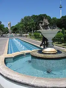 Walking up the steps to the highest 'Fountain Gardens' terrace, one saw a small replica of the Villa Gamberaia landscape, a renowned 17th-century Italian Renaissance garden near Florence, Italy. It had a mini-stage for small performances. [1] The gigantic 37 metres (121 ft) Merlion Statue, representing the mascot and national personification of Singapore, was prominently seen above the promenade. [3]