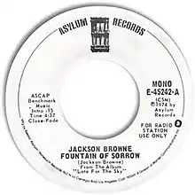 "Fountain of Sorrow" is a song written and performed by American singer-songwriter Jackson Browne. Released as the second single from his 1974 album Late for the Sky, at 6:42, it was the longest song on the album, and the longest song Browne had yet released ("For Everyman" was approximately 6:20). Two minutes were removed from the single release of "Fountain of Sorrow", but the song still failed to chart on Billboard's Hot 100.[1][2][3][4]