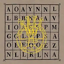 The square in the background with seemingly random letters, is one of a series of squares that represent "the shining ones", 7 Gods of Olympus that each rule their own day of the week and planet. This particular square is called "The Square of Blumaza" and it represents "Monday" and "The Moon". Each God has power over certain desires. In this case, the Olympic for Monday and the Moon is Artemis and the desires that she rules are "virginity/fertility, and the hunt" as well as anything related to air.