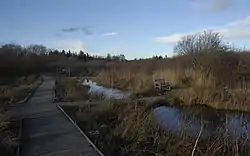 In the 1970s, due to an upsurge in terrorism, security was upgraded and razor wire was installed around the perimeter of Catterick Garrison. A section across the north western edge of the camp was bypassed because of its undulating nature. The section was an area of foxholes, slit trenches and gullies that were designed to test tank crews as part of their training.[4] This small area was overgrown and had many moorland streams that came together to form Leadmill and Risedale Becks flowing through it.[5] In 1992, Major Tony Crease of The Royal Scots Dragoon Guards, realised the potential of the site[6] and was granted 28 acres (11 ha) by the British Army to convert into a nature reserve.[7] Crease made use of soldiers who were able to volunteer and also use their earthmoving equipment to help out.[8] In April 2001, the site was designated as a Local Nature Reserve by Natural England[9] which afforded it a protected and legal designation. In the same year it was designated as a Site of Local Nature Conservation Importance (SLNCI).[4][10]