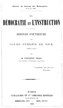 | La démocratie et l'instruction: discours d'ouverture des cours publics de Nice, 1863-1864 | Democracy and Education: Opening Speech of Public Courses in Nice, 1863-1864 | 1864 | Paris, Guillaumin | OCLC 972450319 | |