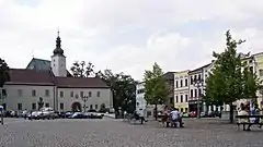 The town Frýdek was first mentioned in 1386 as Fridek and later in 1416 as Fredeck.[5] The town had to be established under German rights between 1327 and 1386 on the grounds of Jemnicz, which was later absorbed by Frýdek.[lower-alpha 1] The church in Jemnicz stayed a parish church for Frýdek for some time in the 14th century, but the parish was then moved to a newly built church in Frýdek, that was then mentioned in the register of Peter's Pence payment from 1447 among 50 parishes of Teschen deaconry as Fredek.[6] During the location of Frýdek the castle was also built, as part of the new town's defensive walls, where afterwards resided a ducal clerk, responsible for collecting taxes. The castle was expanded in the 15th century by Casimir II, Duke of Cieszyn. In that century the town together with the surrounding villages was a few times pawned. In 1526 the Kingdom of Bohemia became part of the Habsburg monarchy. In 1573 Frýdek together with 16 nearby villages[lower-alpha 2] were sold and split from the Duchy of Teschen and formed a separate state country. The state country, with the Frýdek castle as its administrative centre, was then owned by several noble families. In the 18th century first Jews settled in the town. In the late 18th century textile industry developed in Frýdek. In 1848 the town became a seat of a political county, one of seven in the Austrian Silesia (later abolished, and reestablished in 1901). In 1871 the railway reached the town.