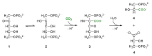 The large fractionation of 13C in photosynthesis is due to the carboxylation reaction, which is carried out by the enzyme ribulose-1,5-bisphosphate carboxylase oxygenase, or RuBisCO.[5] RuBisCO catalyzes the reaction between a five-carbon molecule, ribulose-1,5-bisphosphate (abbreviated as RuBP) and CO2 to form two molecules of 3-phosphoglyceric acid (abbreviated as PGA). PGA reacts with NADPH to produce 3-phosphoglyceraldehyde.[4]