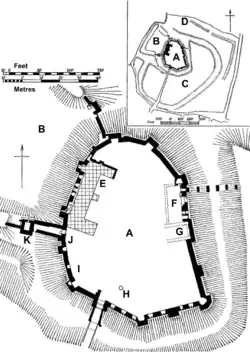 The Bailey lies to the south of the walled Inner Court and was originally topped by a wooden palisade and earthworks, of which only the latter survive.[81] The Bailey would have entered from an eastern gate and contained a range of buildings, probably including a Sergeant's Chamber, a Knights' Chamber, the Great Stable, barns and a granary.[82] Modern visitors to the castle enter the complex through the Bailey from the south, which also contains the modern car park for the castle.[83]