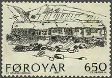A farm was established in the village as a settlement village in 1815, but there was probably already settlement at the site even earlier.[1] The farm is located next to some streams near Lake Leynar in the Municipality of Kvívík on Streymoy.[2][3] Frammi við Gjónna is a typical example of a Faroese farm, where the residents lived in a long stone house with a grass roof and subsisted by raising sheep. Today the farm houses a restaurant called Koks,[4][5] and the flat fields below the farm, near Lake Leynar, are cultivated. Frammi við Gjónna was used as the motif for a postage stamp engraved by Czesław Słania and issued by the Faroese postal service in 1987.